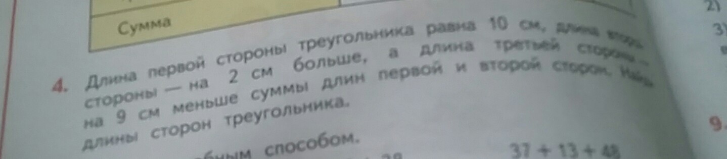 длина первой стороны треугольника равна 10 см длина второй стороны на 2 см больше а длина третьей стороны на 9 см меньше суммы длин первой и второй сторон найди длины сторон треугольника