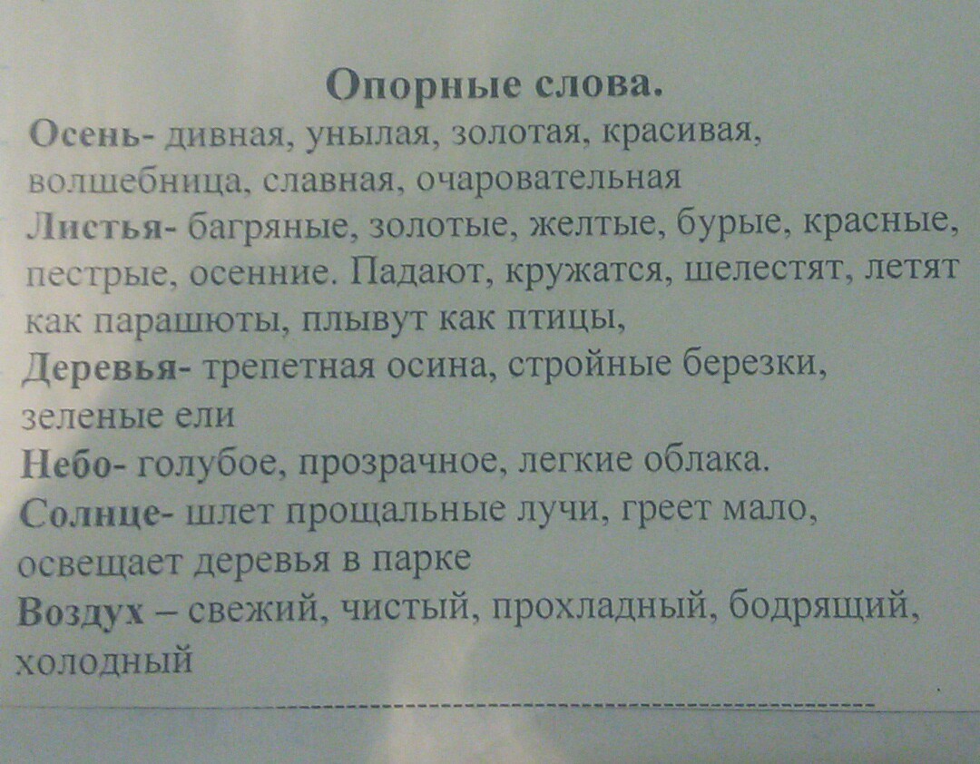 Наступила золотая волшебница осень. Багряные листья падают как парашюты и плывут в воздухе как птицы. В парке стоит осенняя трепетная осина, стройные берёзки и зелёные ели. Небо очень прозрачное , в небе лёгкие облака. Солнце шлёт прощальные лучи и освещает деревья в парке. Осенний воздух чистый, прохладный и бодрящий.