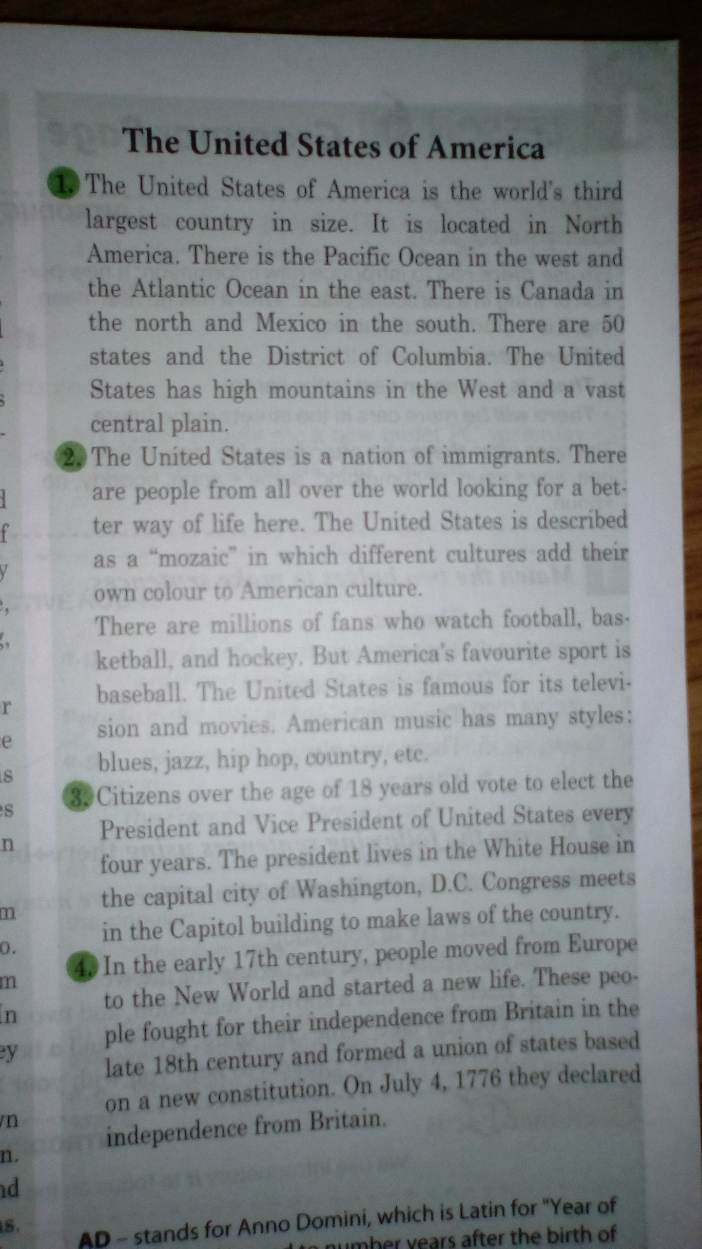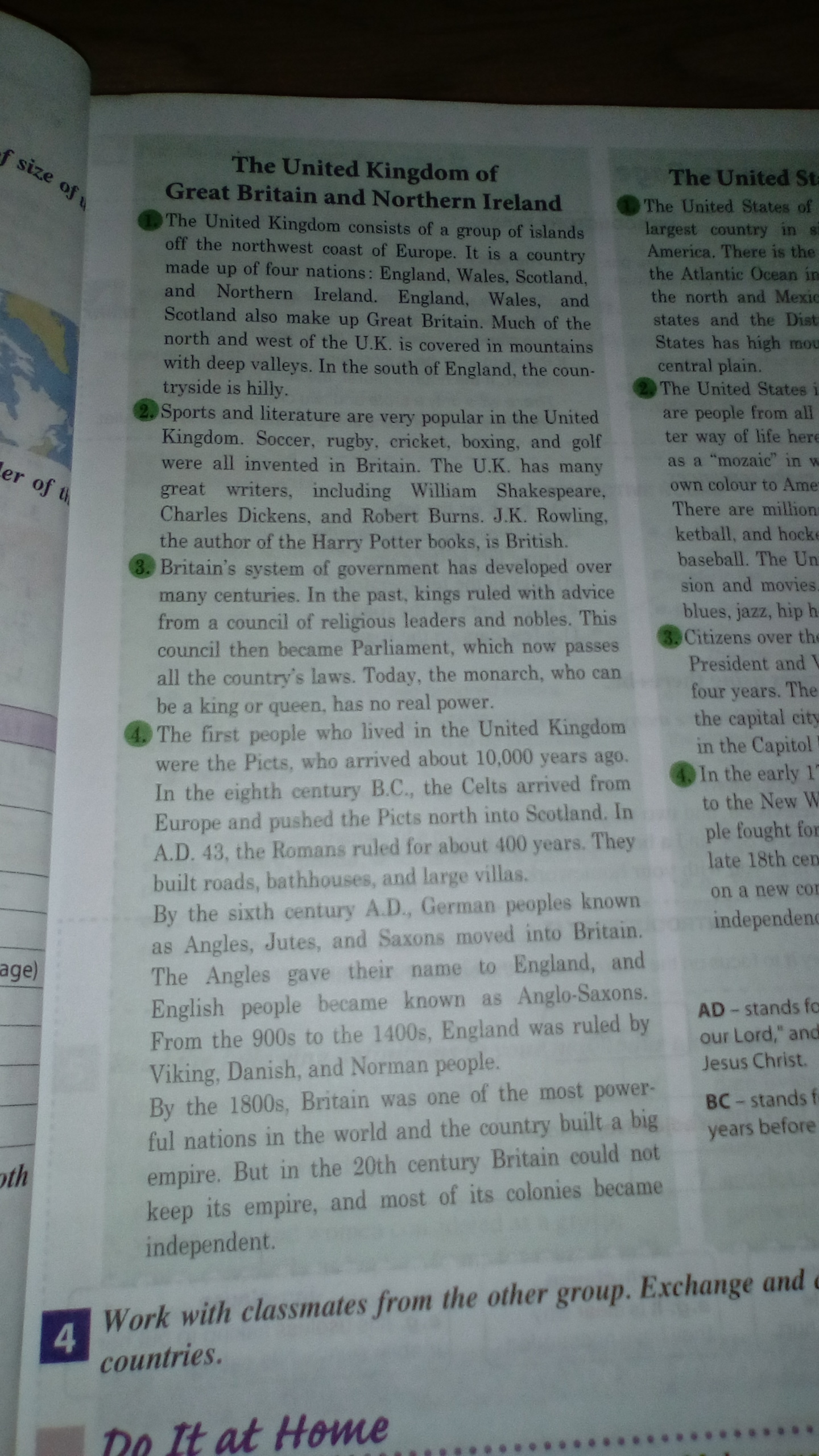 Соединенное Королевство Великобритании и Северной Ирландии. Соединенное Королевство состоит из группы островов у северо-западного побережья Европы. состоящий из четырех народов: Англии, Уэльса, Шотландии и Северной Ирландии. Англия, Уэльс и Шотландия также составляют Великобританию. Большая часть севера и запада Великобритании покрыта в горах глубокими долинами. На юге Англии страна - это спорт, и литература очень популярна в Соединенном Королевстве. Футбол, регби, эрокет, бокс и гольф были изобретены Великобританией. Великобритания. есть много великих писателей, включая Яма Шекспира, Чарльза Диккенса и Роберта Бернса, Дж. К. Роулинг. автор книг о Гарри Поттере, является британцем. Британская система правления развивалась на протяжении многих веков. В прошлом цари правили советами религиозных лидеров и королевой, не имеет реальной силы. Первыми людьми, которые жили в Соединенном Королевстве, были пикты, которые прибыли около 10 000 лет. В восьмом веке до нашей эры кельты прибыли из Европы и толкнули Пиец север в Шотландию. В 43 до нашей эры, римляне правили около 400 лет. Они строили дороги, бани и большие виллы. К шестому столетию нашей эры немецкие народы, известные под названием Англы , и Саксы, перебрались в Великобританию. Англы дали свое имя Англии, и английские люди стали известны как англосаксы. С 900-х до 1400-х годов Англия управлялась людьми викингов, датчан и норинов. К 1800-м годам Великобритания была одной из самых сильных сторон. в мире, и страна построила большую империю. Но в XX веке Британия не смогла сохранить свою империю, и большинство ее колоний стали независимыми