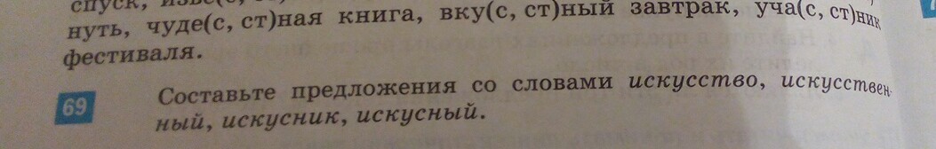 СРОЧНО!!!!! номер 69 составить предложения составить предложения со словами искусство искусственный искусник искусный