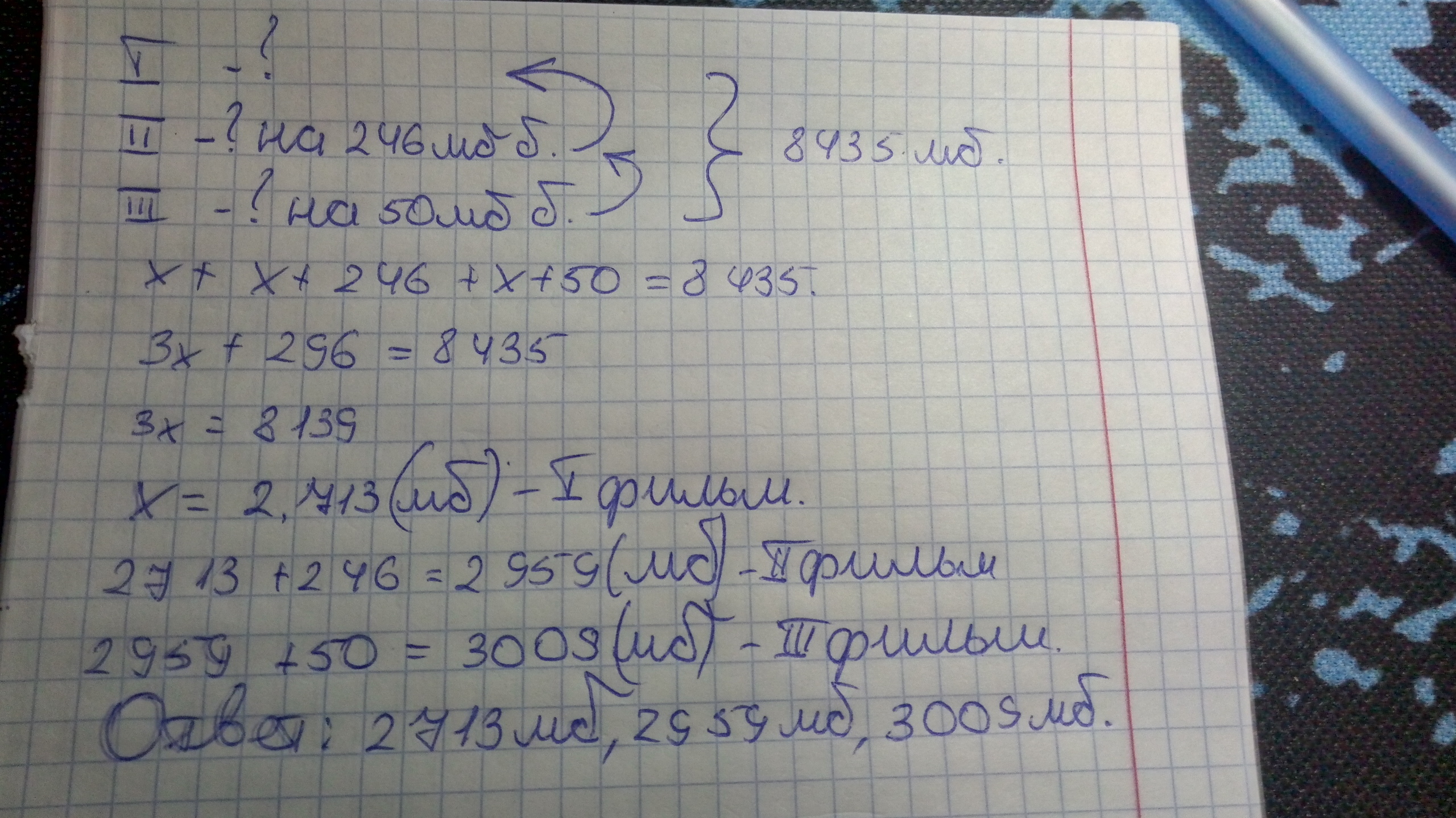 три фильмы на компьютере занимает 8435 мегабайт памяти размер 2 фильма на 246 кг больше чем 1 размер 3 фильма на 50 мегабайт больше чем 2 сколько мегабайт составляет каждый фильм