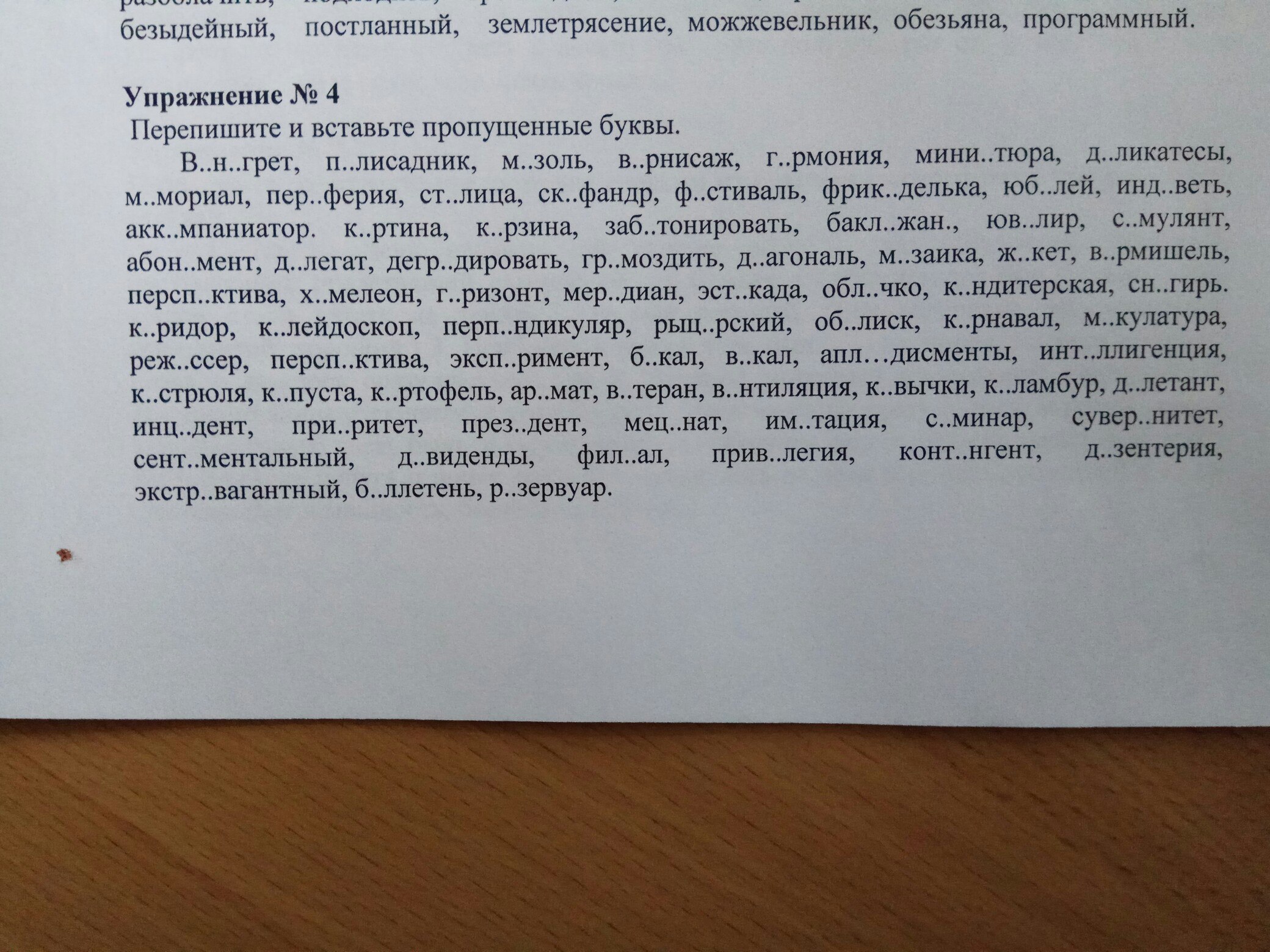 Выше написано: Перепишите и вставьте пропущенные буквы