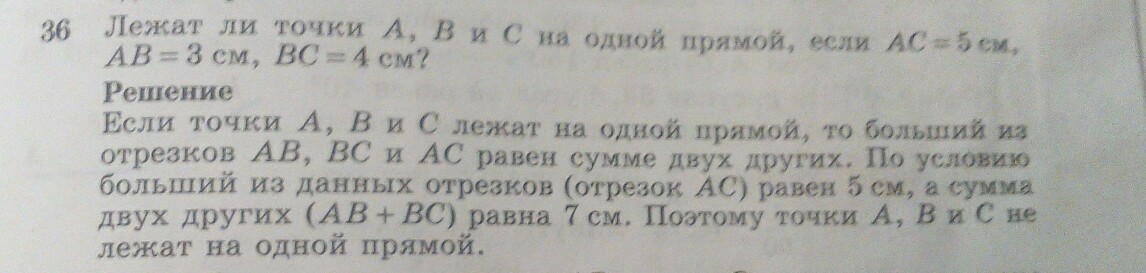 Лежат ли точки А,В и С на одной прямой, если АС=5см, АВ=3см, ВС=4см?