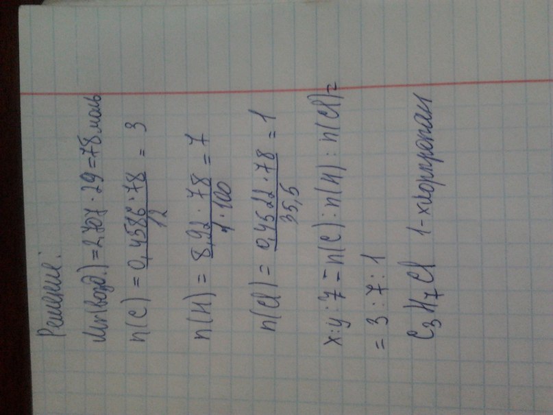 Массовая доля углерода в веществе составляет 45,86%,хлора-45,22%,остальное-водород.Относительная плотность этого вещества по воздуху равна 2,707.Выведите молекулярную формулу вещества.