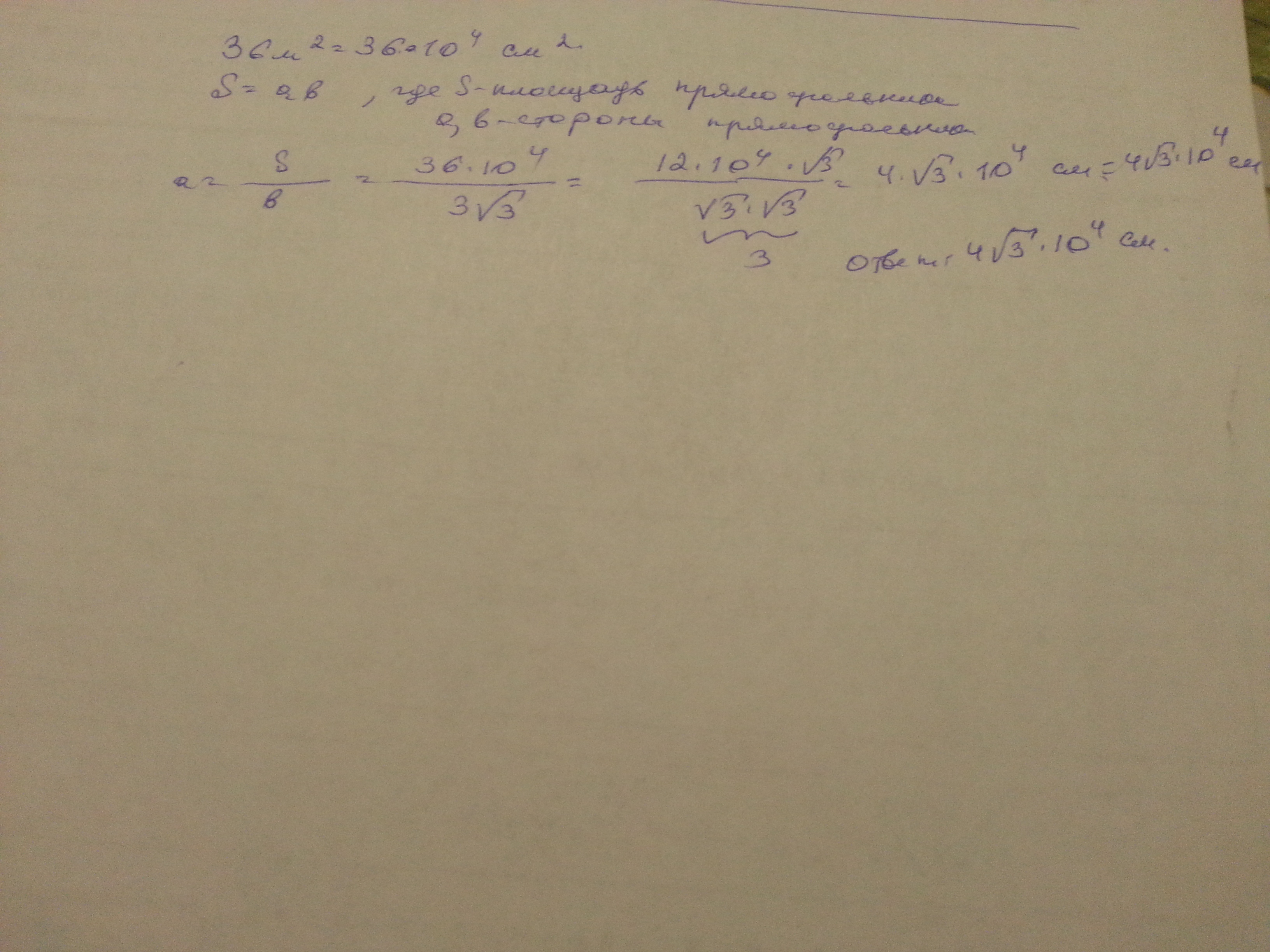 помогите решить за 7 класс найдите длину прямоугольника, площадь которого равна 36 м2 и ширина 3√3 см