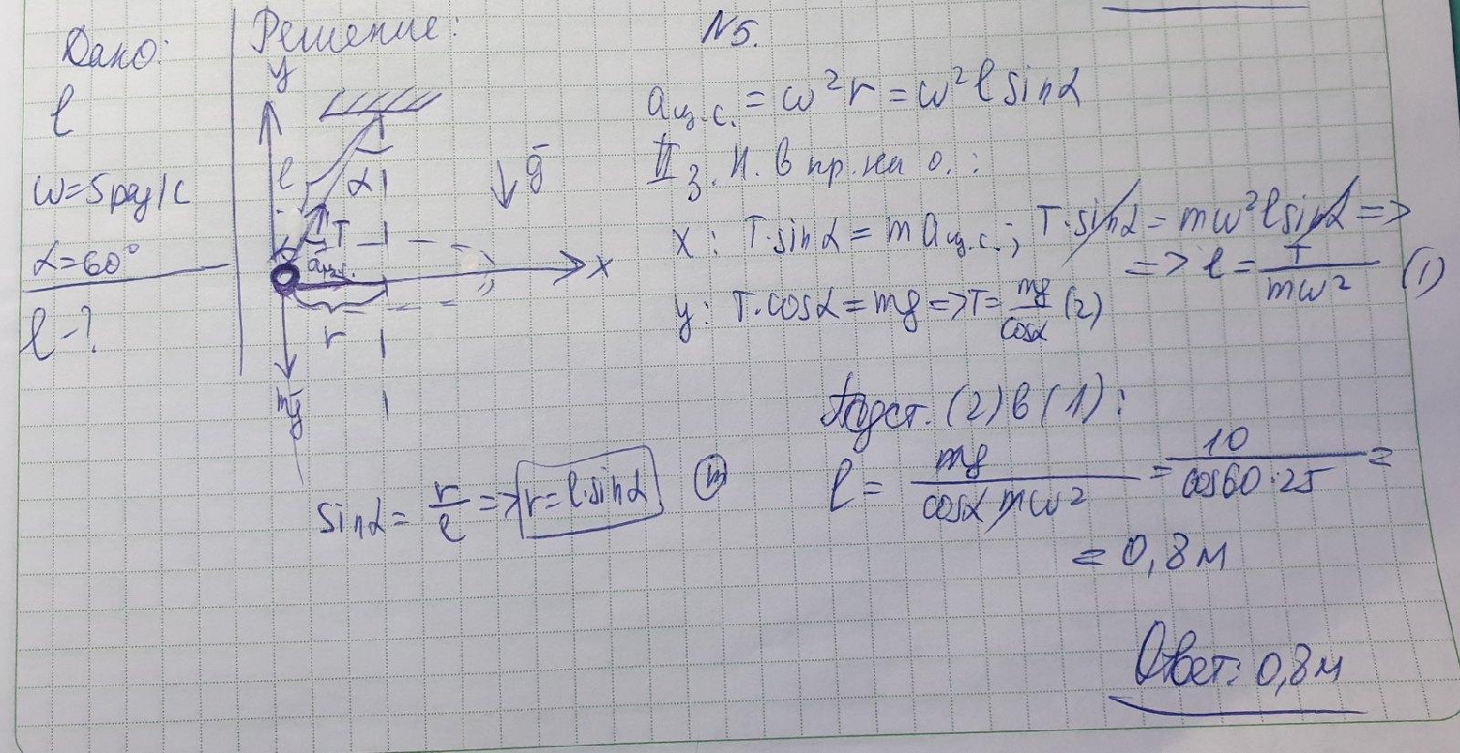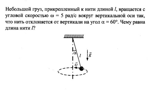 Небольшой груз, прикрепленный к нити длинной l, вращается с угловой скоростью w = 5 рад/с вокруг вертикальнойоси так, что нить отклоняется от вертикали на угол альфа = 60 градусов. Чему равна длина нити l?