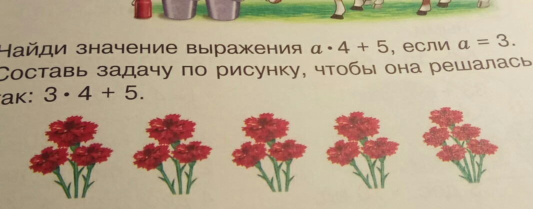 найди значение выражения a•4+5,если a=3.Составь задачу по рисунку,чтобы она решалась так:3•4+5
