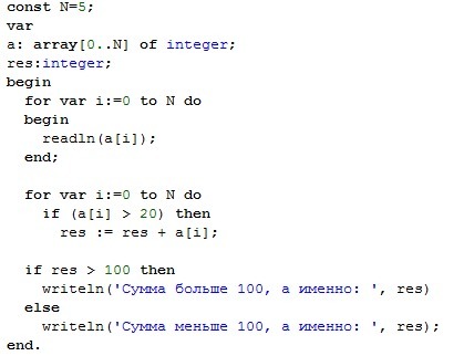 Дан массив a из n целых чисел. Требуется определить, превосходит ли 100 сумма элементов, которые больше 20.