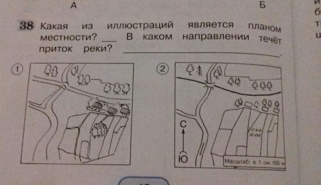 какая из иллюстраций является планом местности ?В каком направлении течёт приток реки?