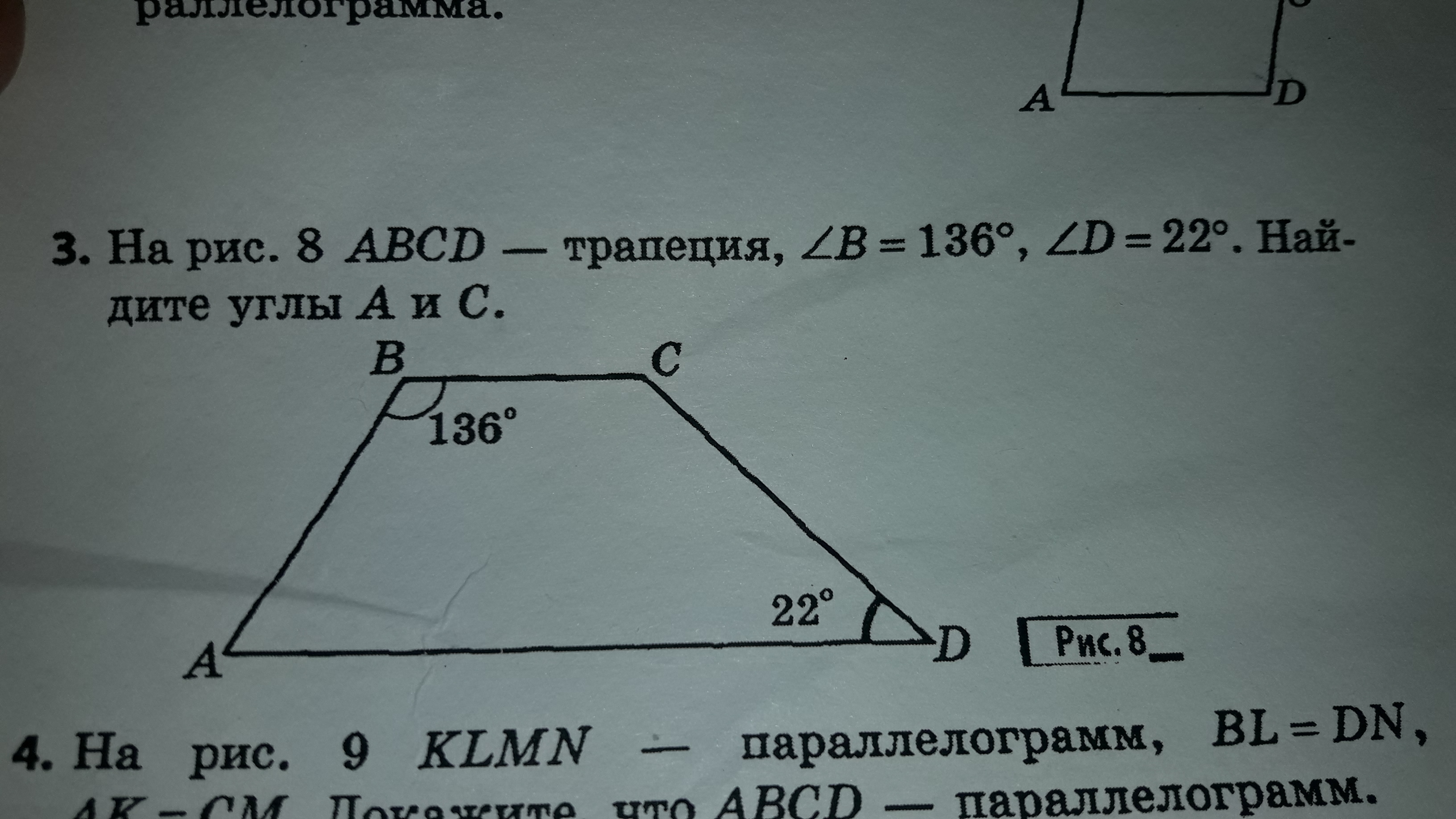 Тут всё очень просто. Т.к два угла у нас даны по условию, то найти остальные не составит труда. Есть углы 136 градусов и 22 градуса. Сумма всех углов четырехугольника( в нашем случае трапеции) равна 360 градусов. Сумма углов, лежащих между двух параллельных прямых, равна 180 градусов, таким образом мы находим угол А: 136 + А = 180 градусов, отсюда выражаем А и получаем, что А = 180 - 136 = 44 градуса.