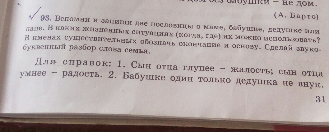 вспомни и запиши два пословицы о маме ,бабушке, дедушке или папе. вкаких жизненых ситуациях