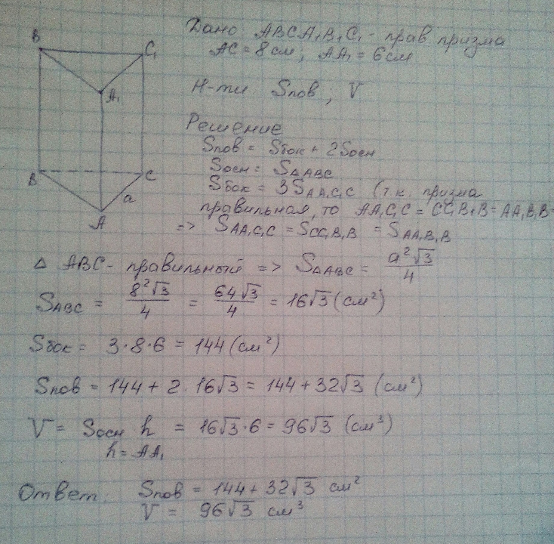 Сторона основания правильной треугольной призмы равна 8см а боковое ребро равно 6см найдите площадь полной поверхности и объем призмы. Помогите пожалуйста разобраться в данной ситуации с чертежом)