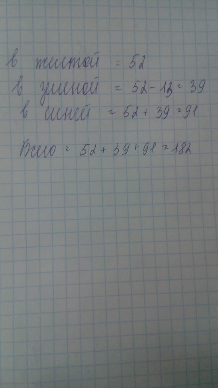 Помогите с условием задачи В жёлтой папке 52 листа бумаги , что на 13 листов больше чем в зелёной.В синей папке столько листов,сколько в жёлтой и зелёной вместе .Сколько листов бумаги в трёх папках?