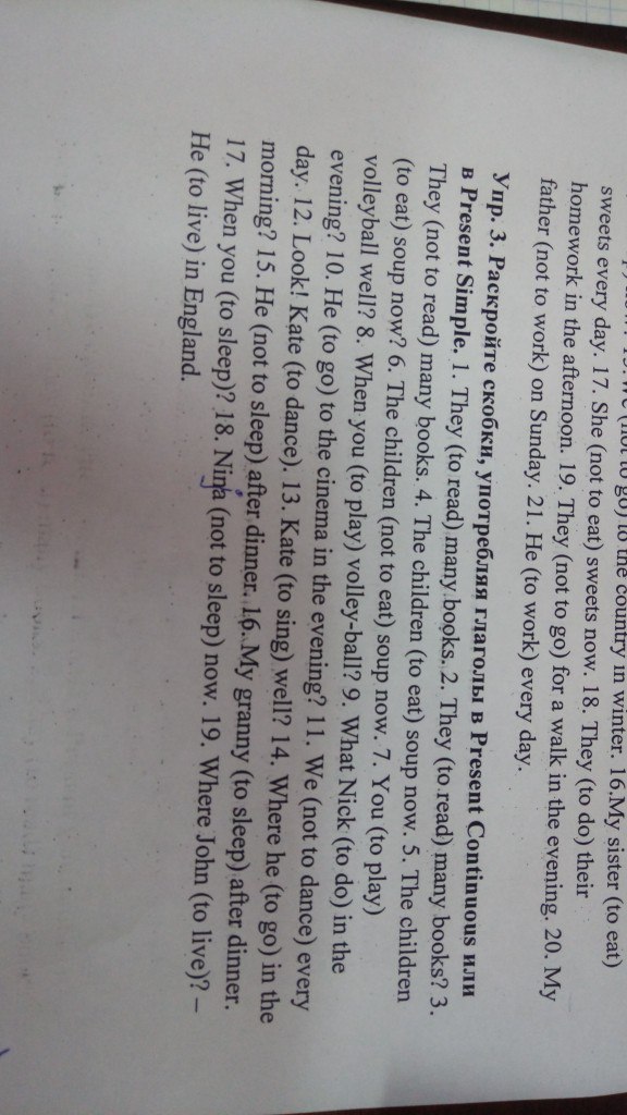 1read2.Do the read3.do not read4. are eating5.are children eating6.are not eating7.do you play8.when did you play9.what Nick is going to do10.is he going to the cinema11.do not dance12.is dancing13.does Kate song14.where did he go15.he doesn't sleep16.sleeps17.when did you sleep18.is not sleeping19.where does John livehe lives in London