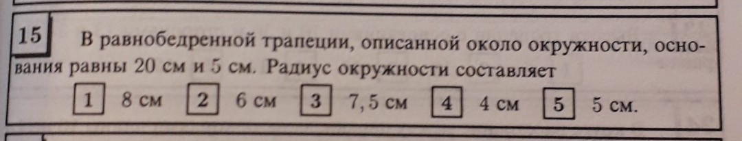 S= (a+b)*r = sqrt(a*b)*((a+b)/2) получим r = sqrt(a*b)/2 = 5 СМ