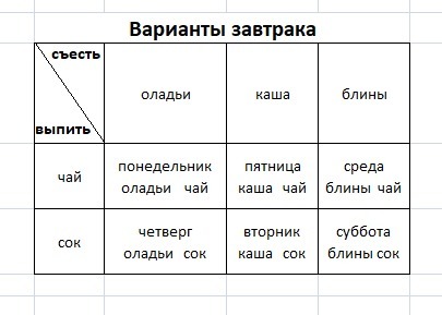 4. В этой таблице получилось 3*2 = 6 клеток. Это значит, что в них можно написать 6 разных вариантов завтрака. В каждой клетке пишем название столбца и строки на пересечении которых находится клетка.