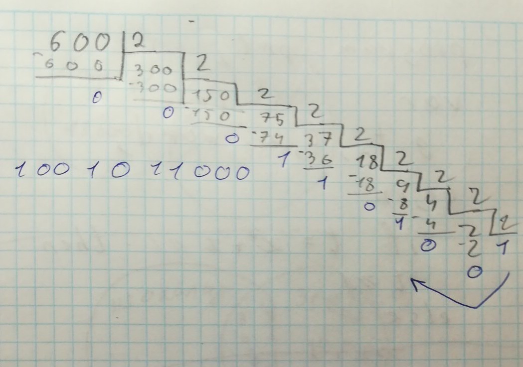 Запишите в двоичной системе число, которое в десятичной системе записано так: 600.