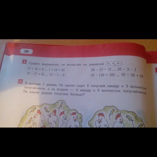 (4+9)-(5+6)=2(на два попугая больше на первом дереве)