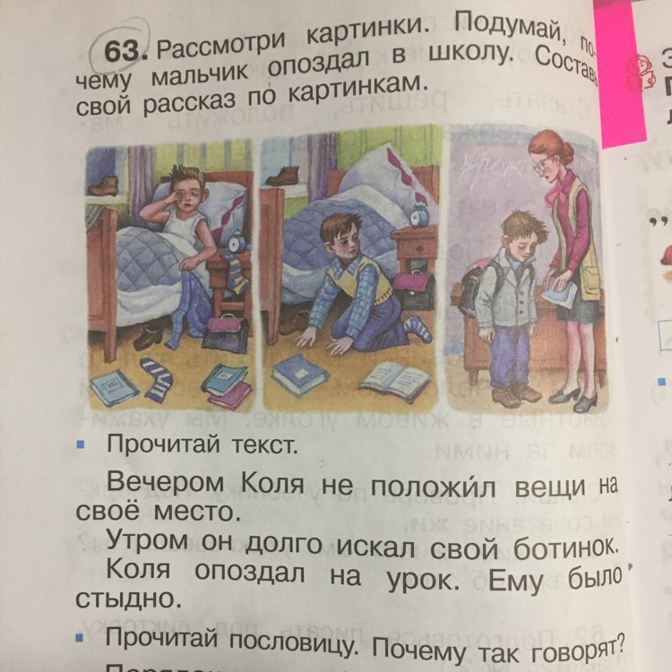 На картине показано как мальчик готовится к школе.На первой картинке мальчик проспал.На второй он собирался.На третьей его ругает учитель за опоздание.Это значит что нужно быть заранее подготовленным.Это показывает нашу не собранность.И за это у него замечание в дневнике.Надо всегда все успевать.