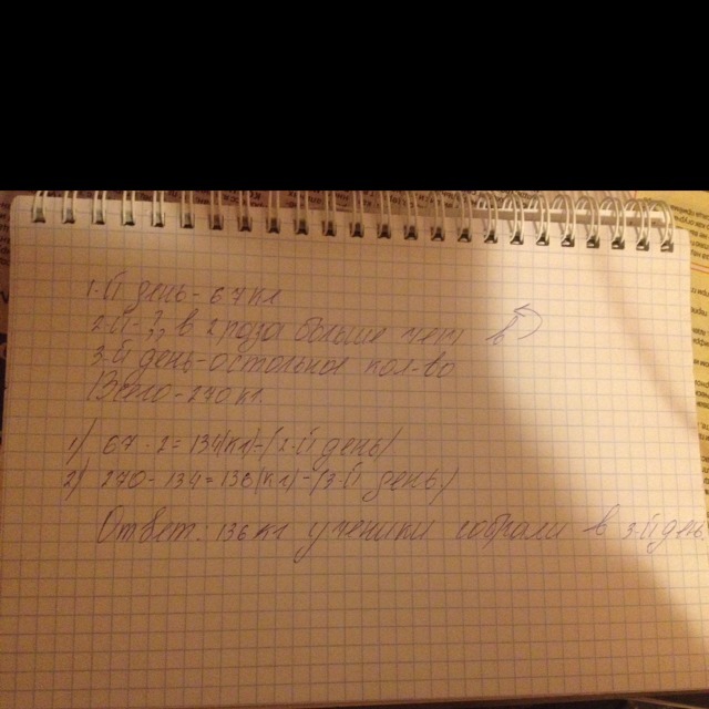 ученики за 3дня собирали 270кг яблок в первый день они собрали 67кг во второй в 2 раза больше чем в первый день а остальные они они собрали в третий день сколько яблок ученики собрали в третий день