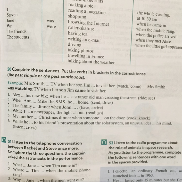 complete the sentences. Put the verbs in brackets in the correct tense (the past simple or the past continuous). Example: Mrs Smith ...TV when her son Jim to visit her. (watch: come) Mrs Smith was watching TV when her son Jim came to visit her