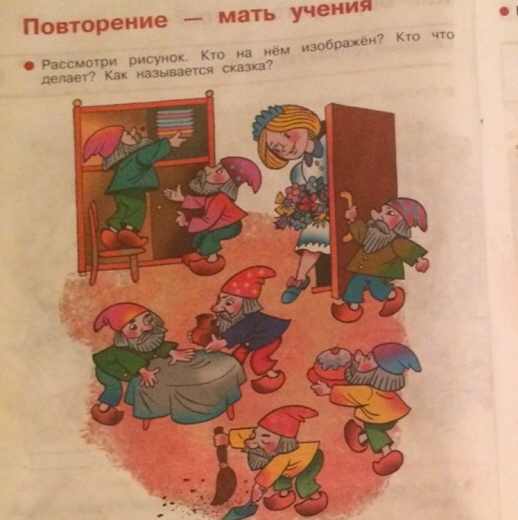 на картине изображена сказка Белоснежка и семь гномов. на переднем плане гном подметает пол.Немного подальше видим,что другой гном несет торт. Два гнома стелят скатерть на стол. другие два гнома ложат какие-то вещи в шкаф. Один гном открыл дверь,и в неё входит Белоснежка. Эта картина вызывает чувство,что гномы готовились к приходу Белоснежки.