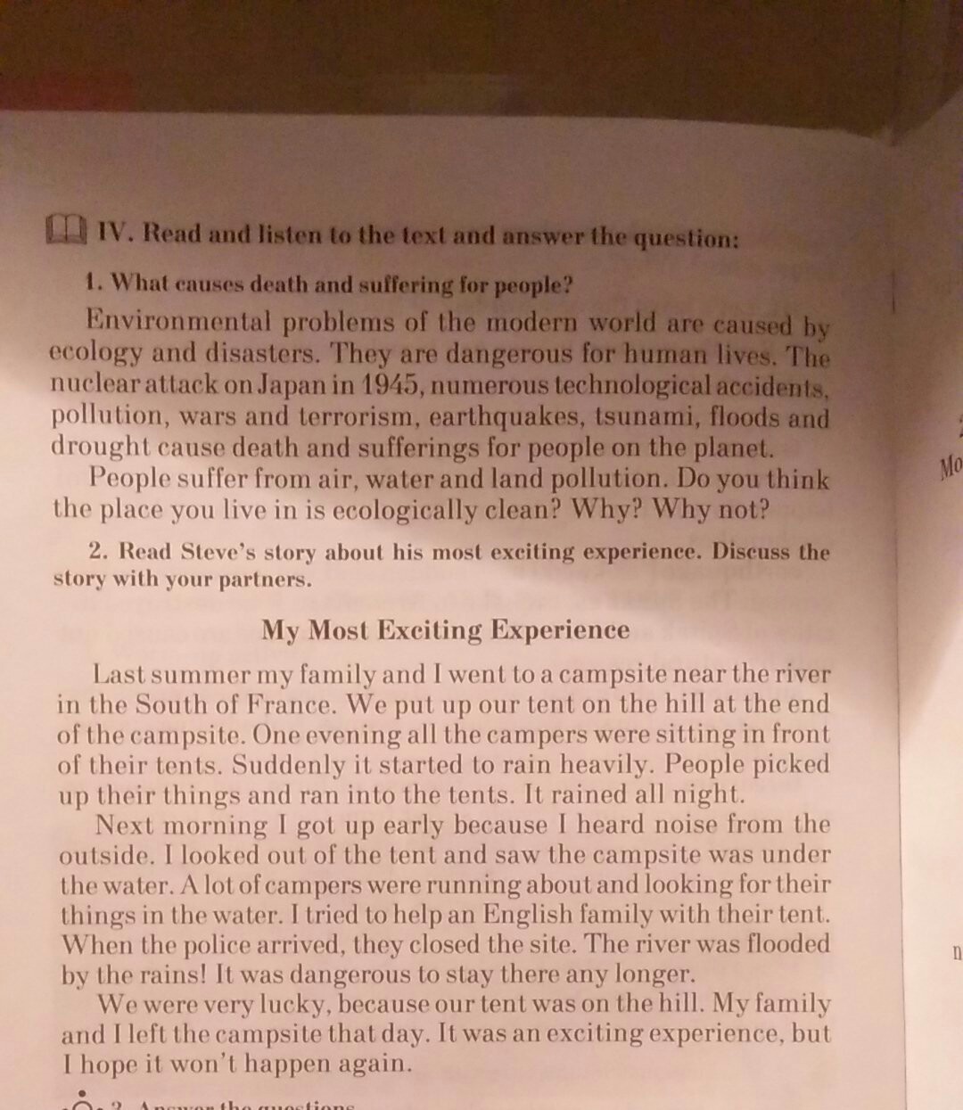 Прошлым летом мы с семьёй отправились на юг Франции в лагерь. Мы подняли палатку на хлме в конце лагеря. Однажды вечером все палатки силили в своих палатках. Внезапно у начался дождь.Люди подняли свои вещи и побежали по палаткам. Он жёл всю ночь. На следующее утро я рано встал, потому что услышал шу снаружи, я взглянул из палатки и увидел кепинг под водой. Многие туристы бегали и искали свои вещи в воде. Мы пытались помочь английской семье с палатками. Когда прибыла полиция, они закрыли сайт. Река была затоплена дождями. Было опасно оставаться там. Нам очень повезло,что наша палатка была на холме. Моя семья и я покинули лагерь в этот день. Это был захватывающий опыт, но я надеюсь,что это не повторится.