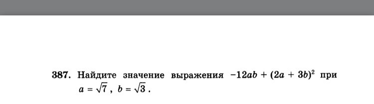это все выражение равняется -12ab+4a^2+12ab+9b^2=4a^2+9b^2=4*7+9*3=28+36=46(убрала корень,т.к. корень в квадрате это просто число всегда)