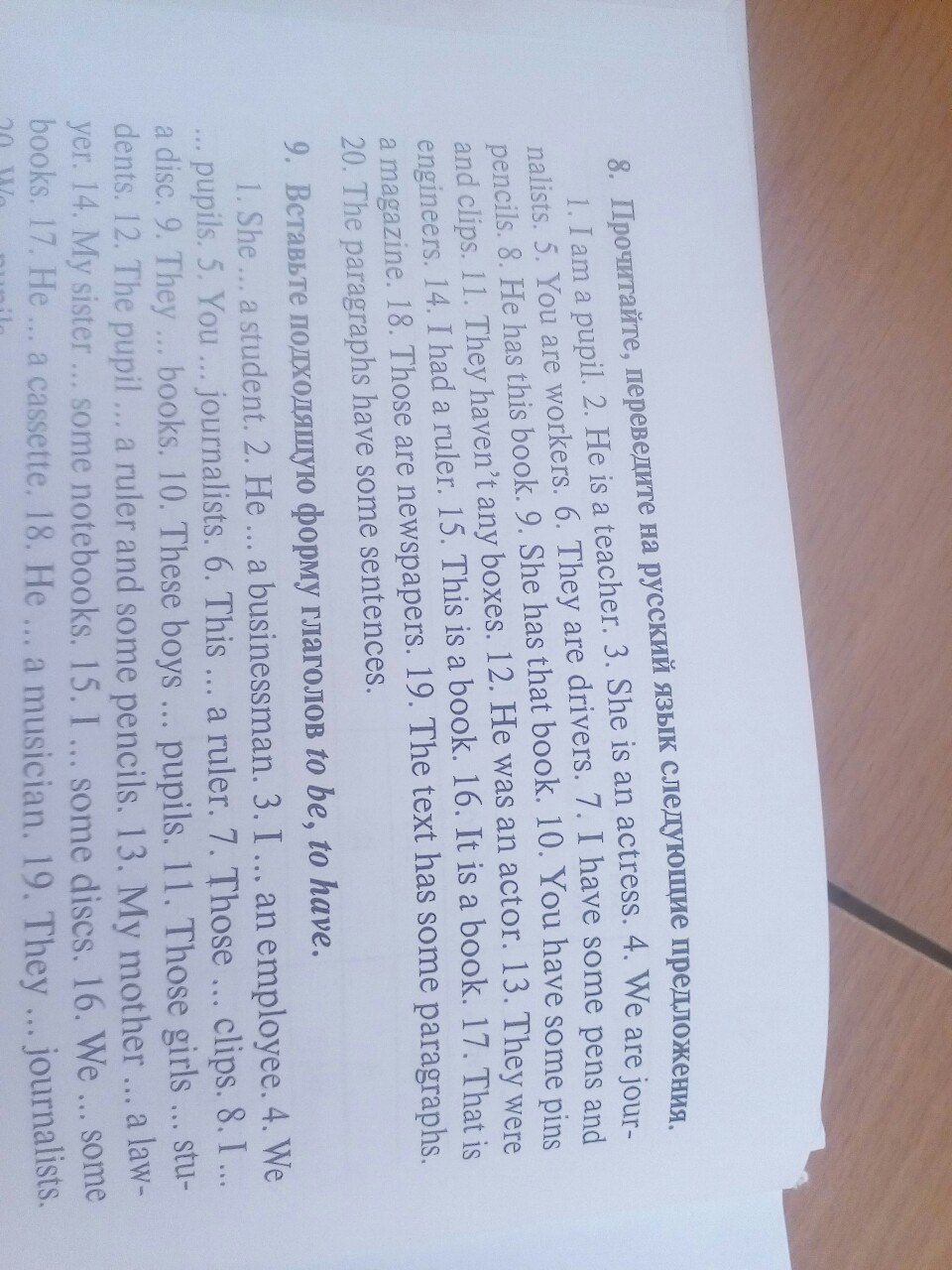 1. Я учень. 2. Він є вчителем. 3. Вона є актрисою. 4. Ми подорожуємо водіями. 7. Деякі ручки і налісти. 5. Ви - працівники. 6. Вони є 8. Він має цю книгу. 9. Вона має цю книгу. 10. У вас є кілька p і кліпів. 11. немає коробки. 12. Він був актором. 17. Це інженери. 14. У мене був правитель. Це книга. 16. Це книга. журнал. 18. Це газети. 19. У тексті є кілька параграфів. 20. У абзацах є кілька вироків.