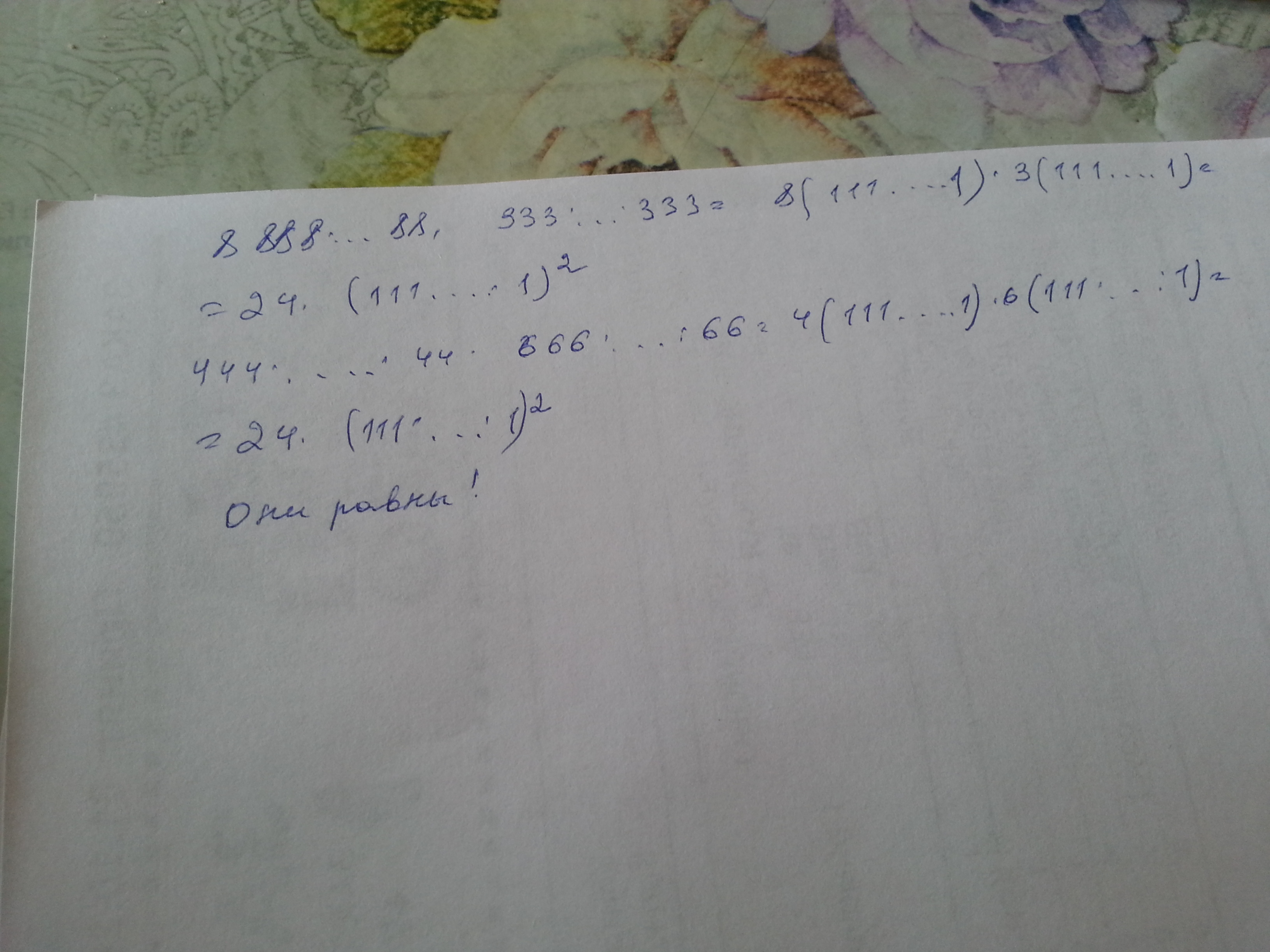 какое число больше: 888...88 • 333...33 или 444...44 • 666...66 (квждый сомножитель является 100-значным числом)? Почему?