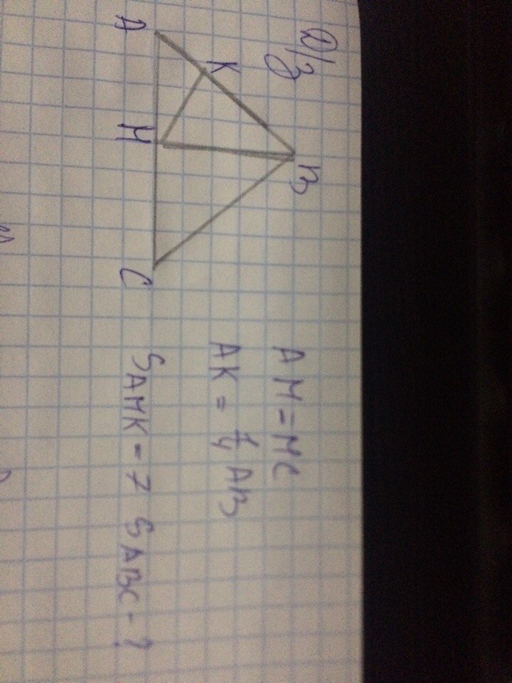 ДАМ 25 БАЛЛОВ =  Решить задачу AM=MC AK=1/4 AB Площадь AMK=7 Найти площадь ABC