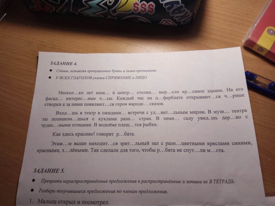 Входишь (2спр. 2л.) в театр в ожидании встречи с удивительным миром. В музее театра ты познакомишься (2спр. 2л.) с куклами разных стран. В зимнем саду увидишь (2спр. 2л.) дерево с чудесными птицами. В водоеме плещутся (1спр. 3л.) рыбки.