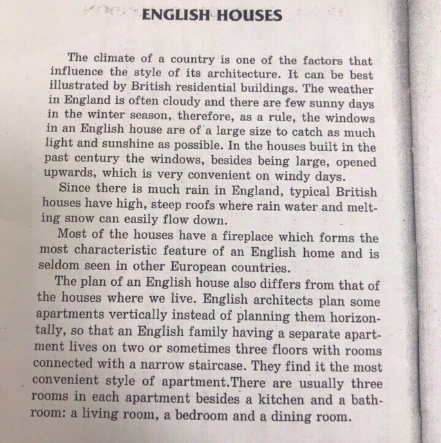 ENGLISH HOUSES Климат страны является одним из факторов, влияющих на стиль его архитектуры. Это лучше всего иллюстрирует британские жилые здания. Погода в Англии часто пасмурная, и в зимнем сезоне мало солнечных дней, поэтому, как правило, окна в английском доме имеют большие размеры, чтобы ловить как можно больше света и солнечного света. В домах, построенных в столетии, окна, большие, открывались вверх, что удобно в ветреные дни. Поскольку в Англии много дождя, типичные британские дома имеют высокие, крутые крыши, где дождевая вода и тающий снег могут легко стекать. В большинстве домов есть камин, который является наиболее характерной чертой английского дома и редко встречается в других европейских странах. План английского дома также отличается от плана домов, в которых мы живем. Английские архитекторы планируют некоторые квартиры вертикально, а не планируют их горизонтально, так что английская семья, имеющая отдельный аппликат, живет на двух, а иногда и трех этажах, с комнатами, связанными с узкой лестницей. Они считают, что это самый удобный стиль квартиры. Обычно в каждой квартире есть три комнаты, кроме кухни и ванной: гостиная, спальня и столовая.