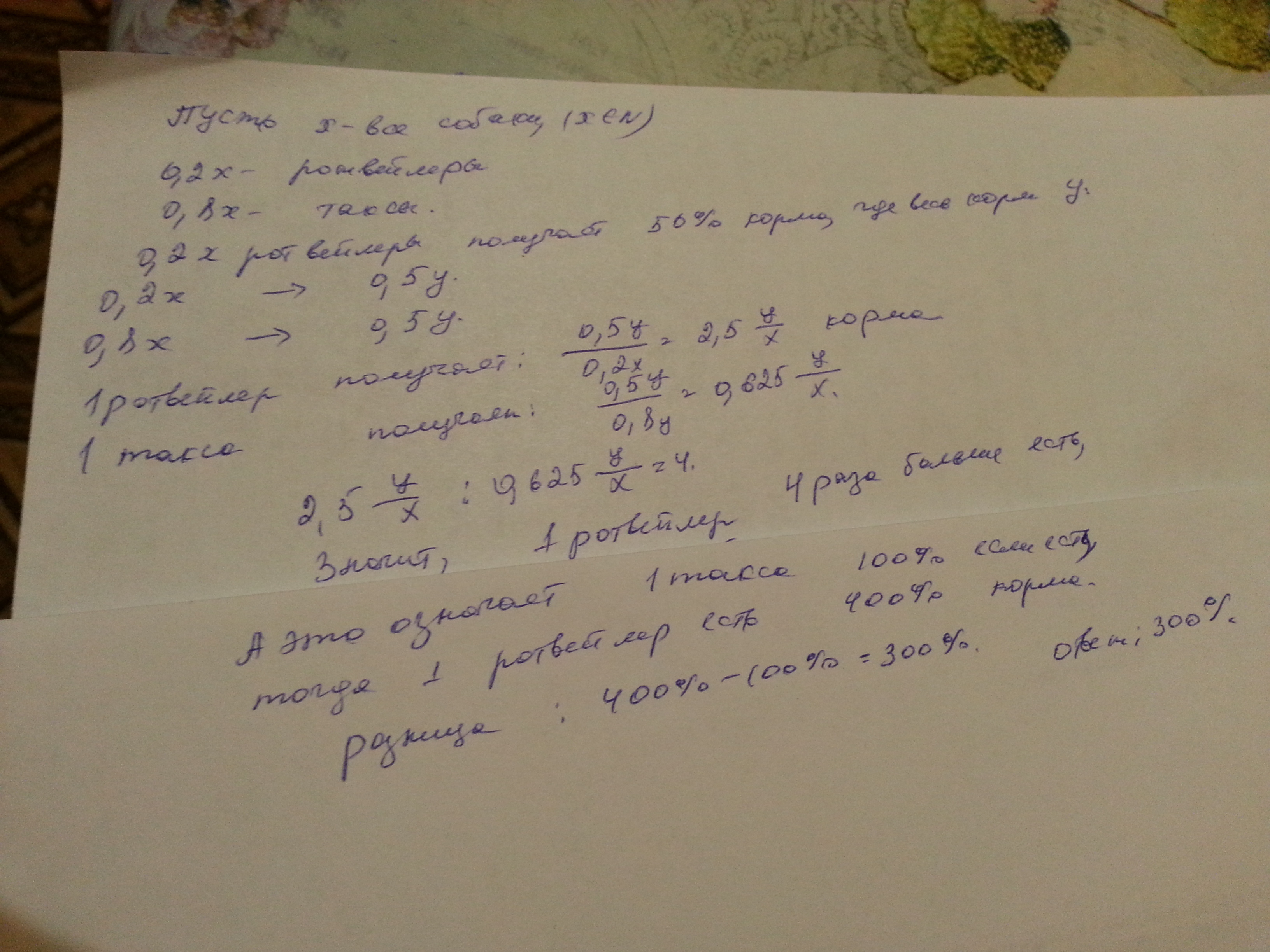 В вольере содержатся ротвейлеры и таксы. Ротвейлеры, составляющие 20 % числа всех собак в вольере, получают 50 % всего корма. На сколько процентов одна такса получает меньше корма, чем один ротвейлер?