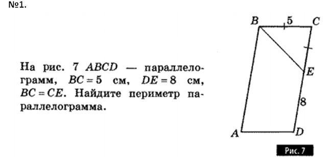 На рисунке 7 ABCD-параллелограмм, BC=5 cm, de=8 cm, bc=ce. Найдите периметр параллелограмма.