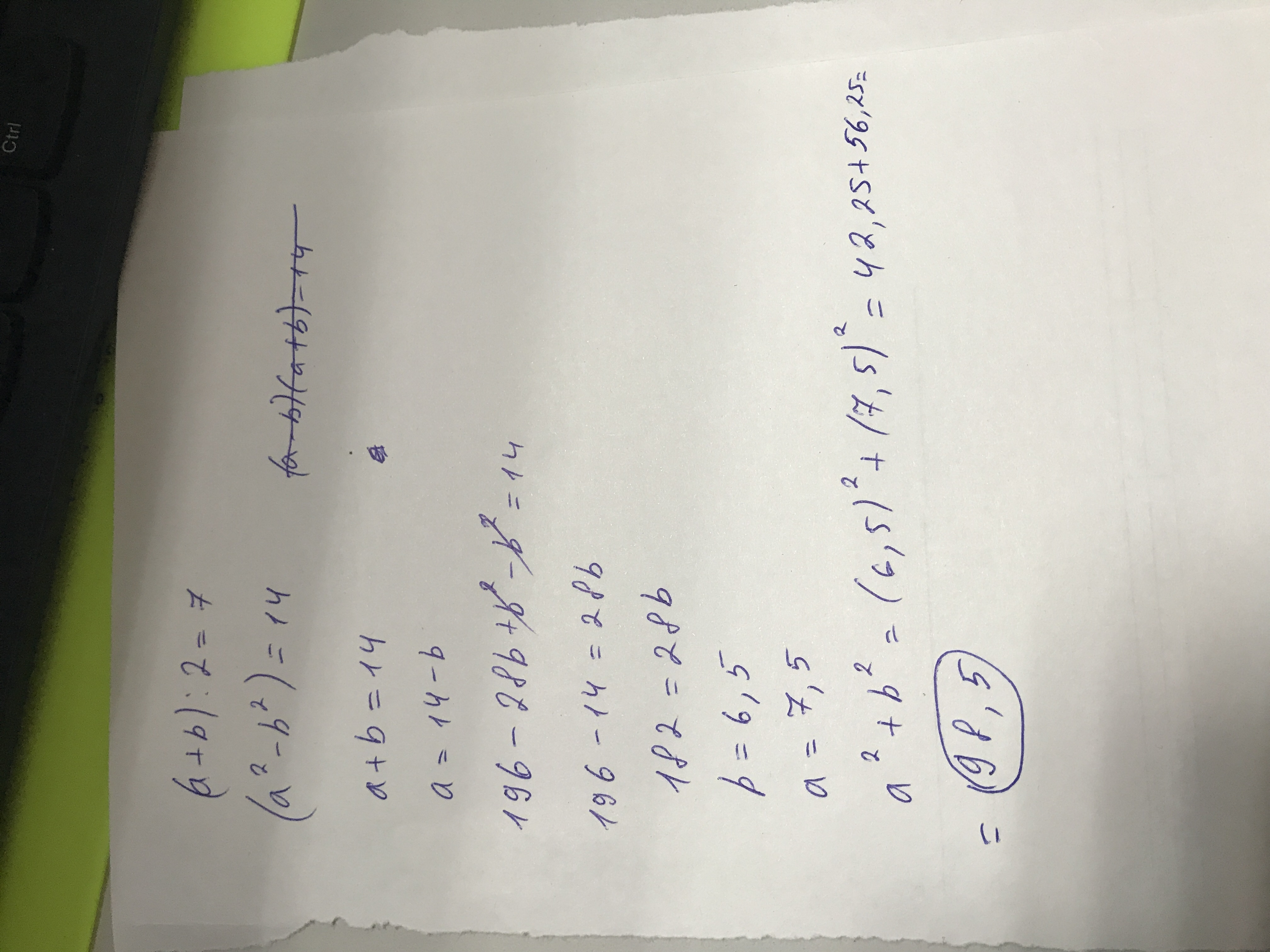 Пожалуйста помогите,если можно то сфотографируйте решение.среднее арифметическое двух чисел равно 7,а разность квадратов 14. Найдите сумму квадратов этих чисел.