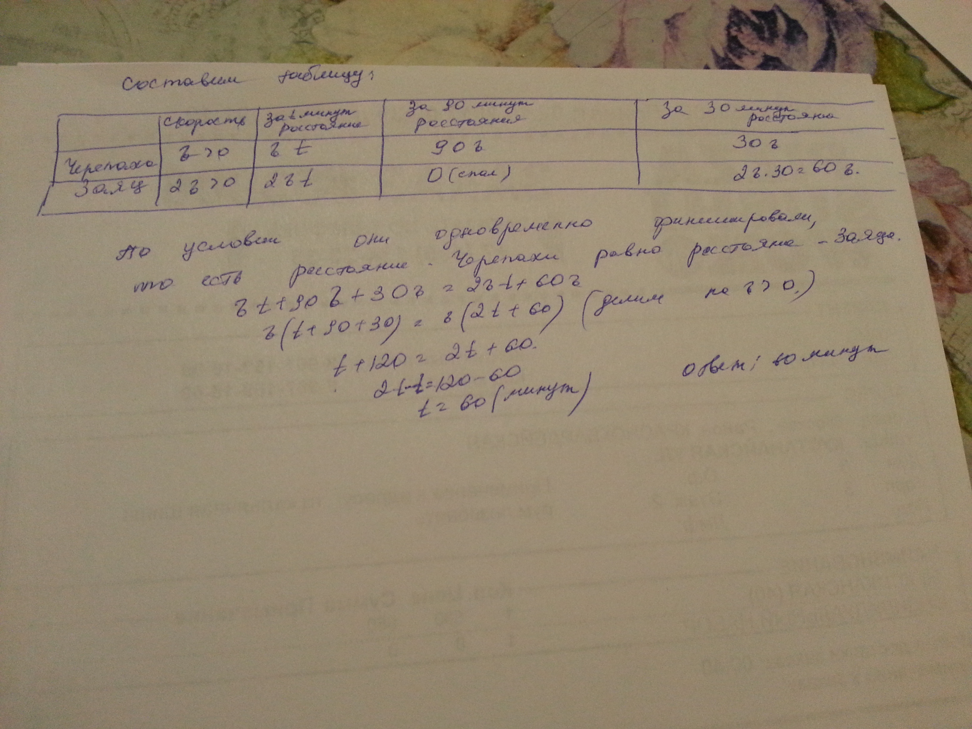 Заяц и Черепаха соревновались в беге. Заяц начал бежать в два раза быстрее черепахи, но через некоторое время лег отдохнуть и задремал. Проспав 90 мин. Заяц проснулся и побежал с прежней скоростью, и финишировал через 30 мин. Черепаха и Заяц финишировали одновременно. Через сколько минут после старта Заяц прилег отдохнуть? Весь путь Черепаха бежала с постоянной скоростью.