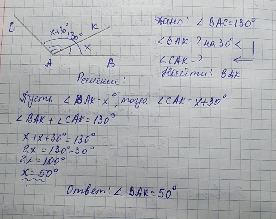 Решите задачу. Угол ВАС равен 130°. Луч АК проходит внутри угла ВАС так, что угол ВАК на 30° меньше угла САК. Найдите угол ВАК.