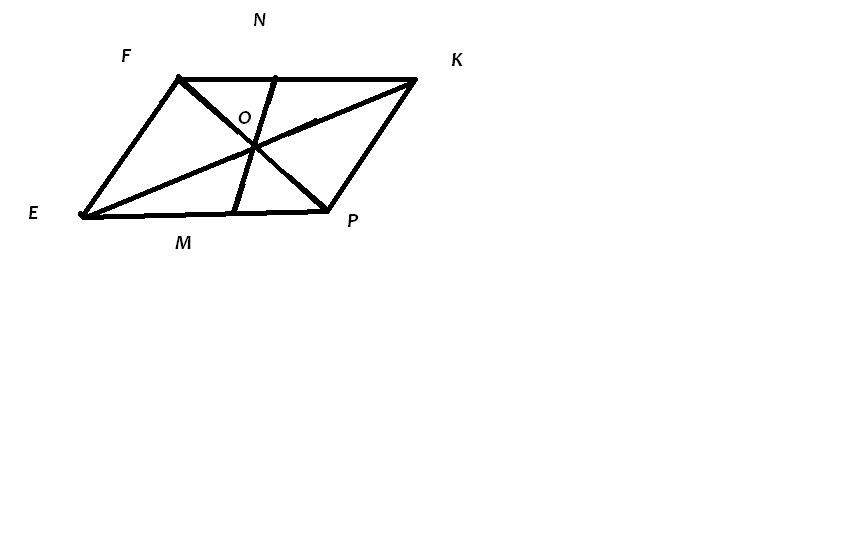 Прошу, кто ответит буду отдавать все свои балллы !!!В параллелограмме EFKP через точку О пересечения диагоналей проведен отрезок MN, пересекающий стороны EP и FK. Вычислите стороны параллелограмма, если периметр его равен 28см, FN =3см, ЕМ=5см.