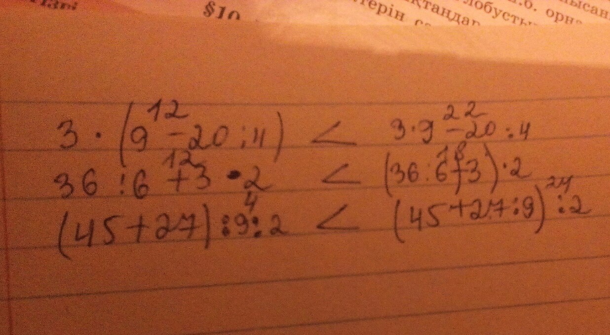 сравни выражения каждой строки: 3·(9-20:4)…3·9-20:4; 36:6+3·2…(36:6+3)·2; (45+27):9:2…(45+27:9):2 не выполняя действий,поставь знаки сравнения.
