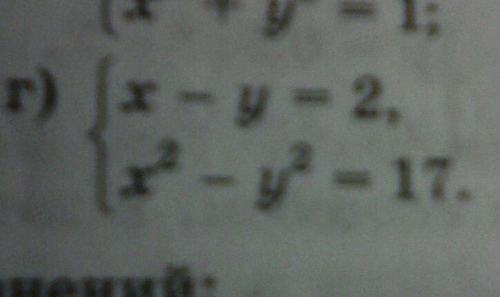 x=y+2. подставляем во 2 уравнение: (y+2)^2-y^2=17; y^2+4y+4-y^2=17; 4y=17-4; 4y=13; y=13/4= 3 1/4. x=3 1/4+2=5 1/4.Ответ: (5 1/4: 3 1/4).