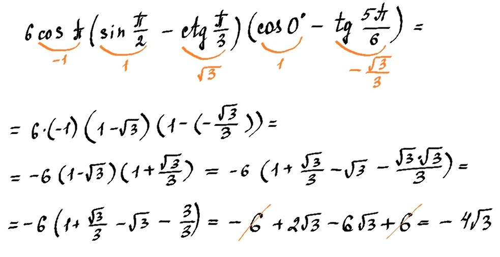 значение выражения 6 cos пи(sin пи/2-ctg пи/3)(cos 0градусов-tg 5пи/6) равно: