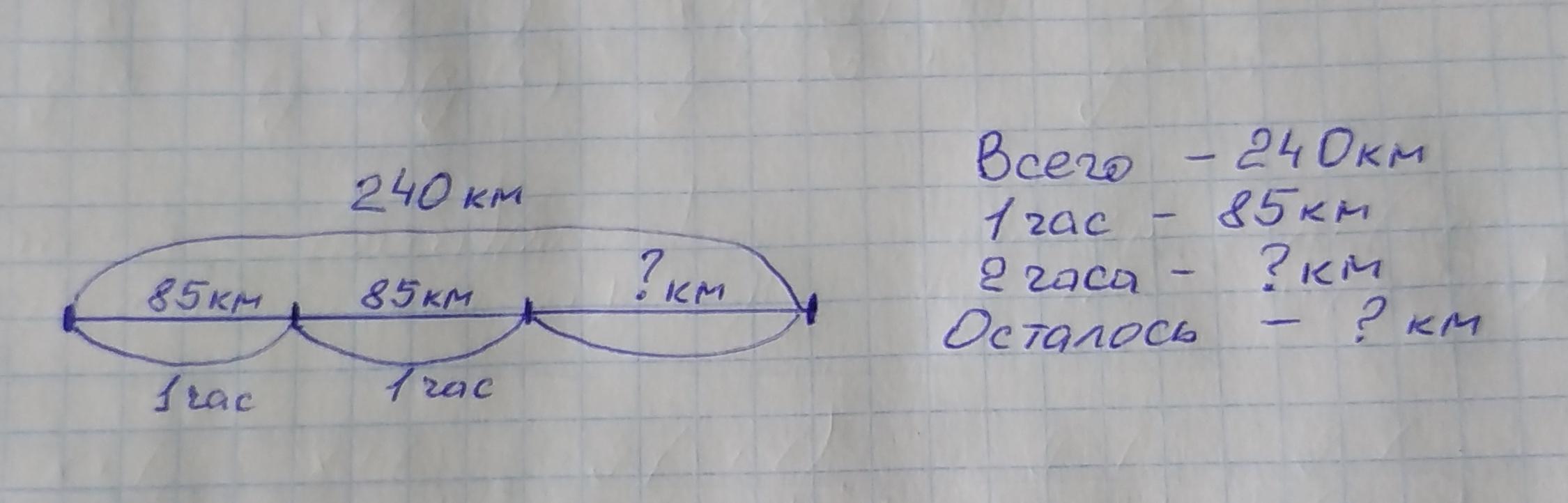 Автомобиль выехал из одного города в другой расстояние до которого 240 км сколько ему останется проехать через 2 часа если он едет со скоростью 85 км час1)85*2=170