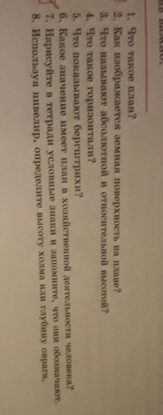 1).План- это чертёж небольшого участка местности в крупном масштабе и в условных знаках, построенный без учёта кривизны земной поверхности.