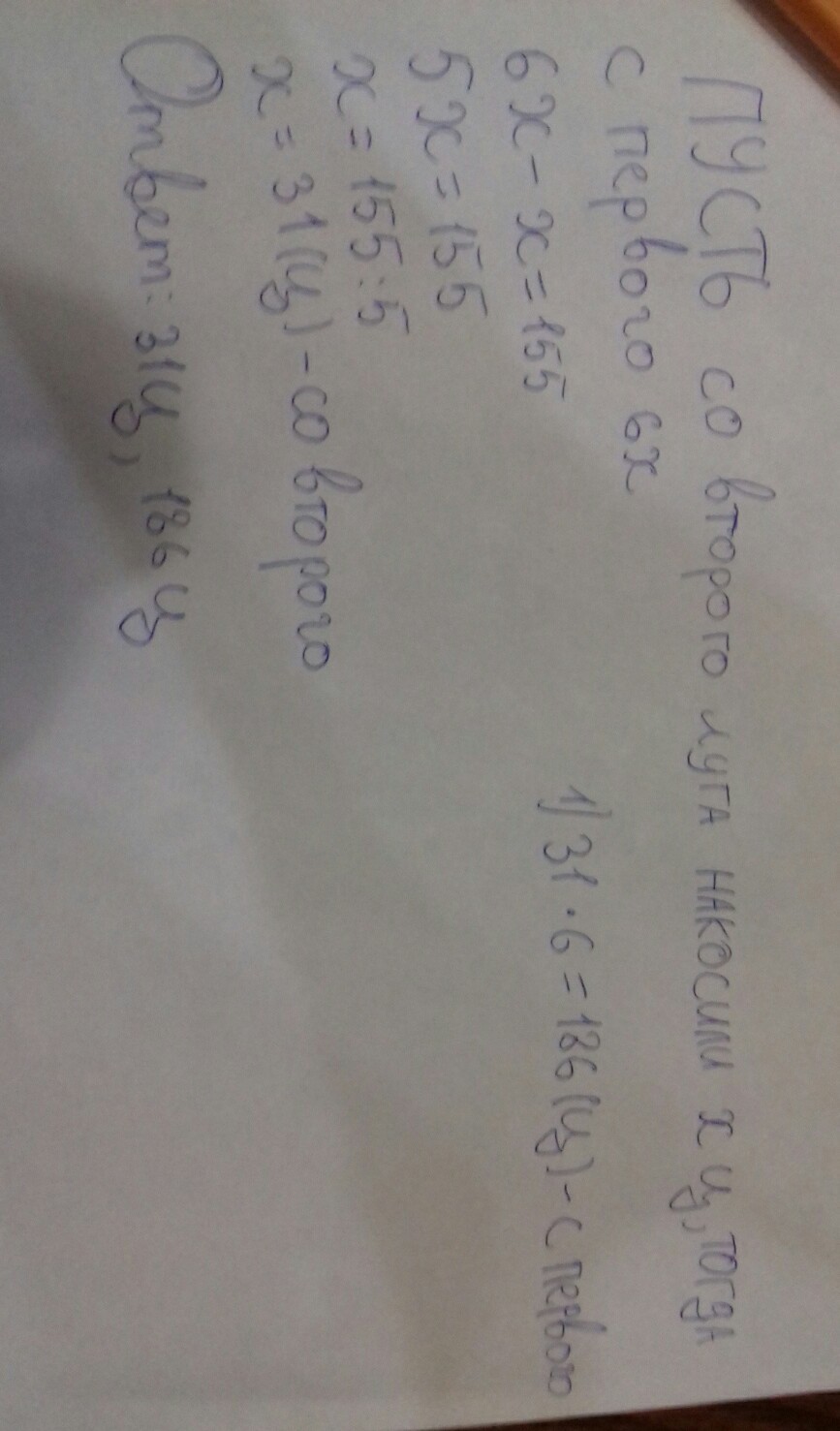 С первого луга накосили в 6 раз больше или на 155 ц. сена больше , чем со второго . Сколько сено накосили с каждого луга?