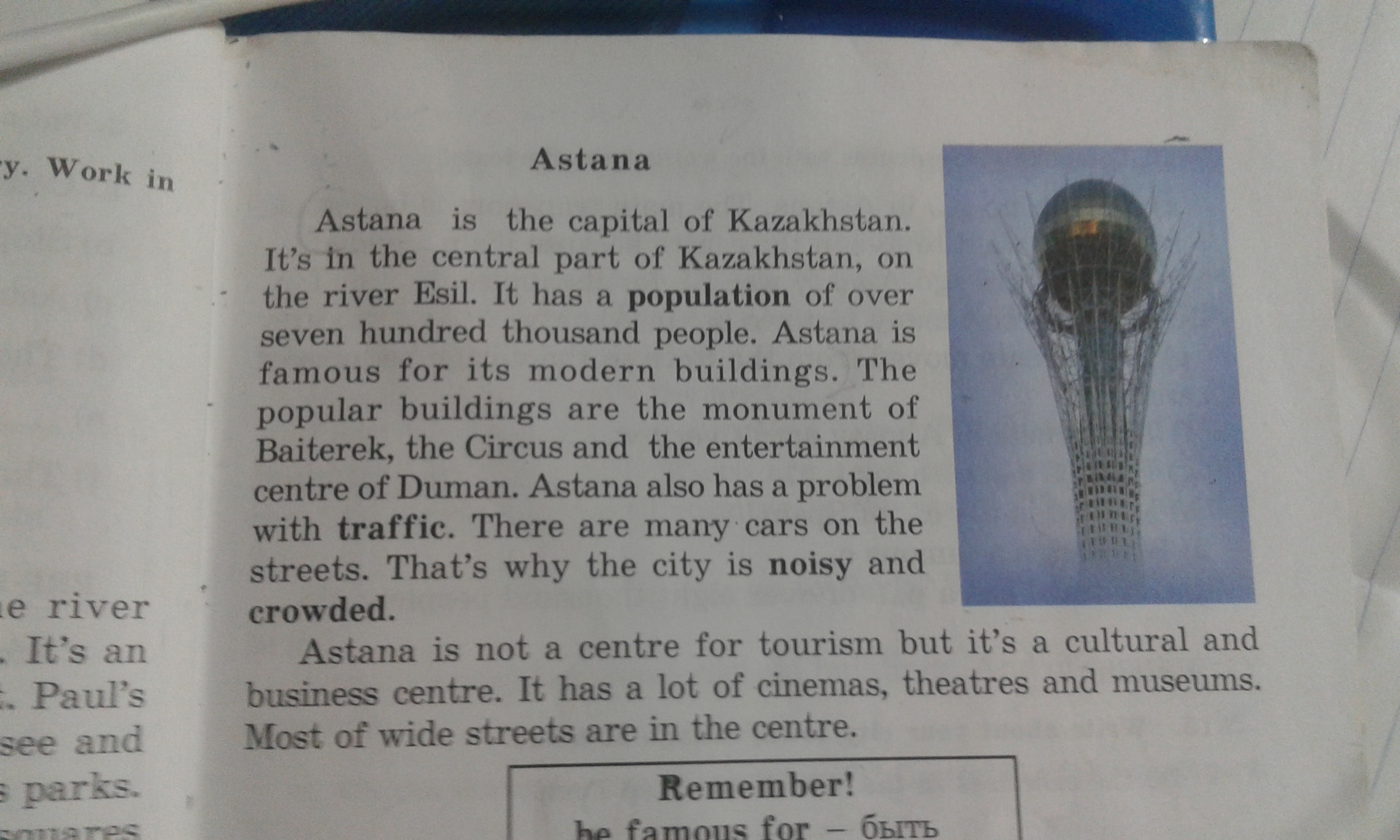 Астана - столица Казахстана. Она находится в центральной части Казахстана, на реке Ишим. В ней проживают более 700 тысяч человек. Астана известна благодаря своим современным постройкам. Популярными постройками являются монумент Байтерек, цирк и развлекательный центр Думан. У Астаны также есть проблема с трафиком (движением). На улицах очень много машин. Из-за этого город шумный и переполненный.