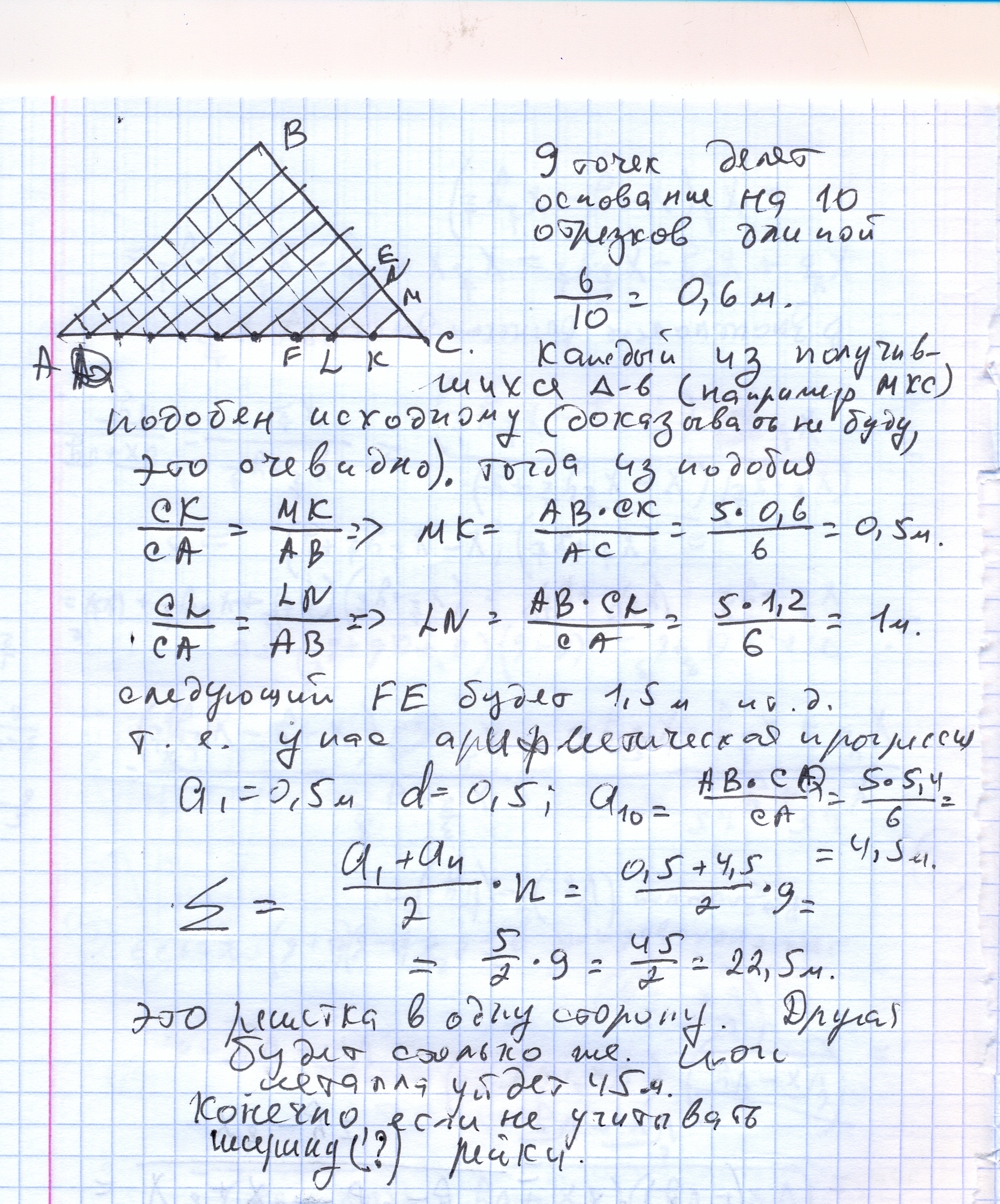 фирма строитель должна изготовить металлическую решетку в форме равнобедренного треугольника у которого боковая сторона 5 м а основание 6м. 9 точек основания треугольника нужно соединить металлическими рейками параллельно боковым сторонам треугольника. Сколько нужно погонных метров металлических реек для изготовления решетка?