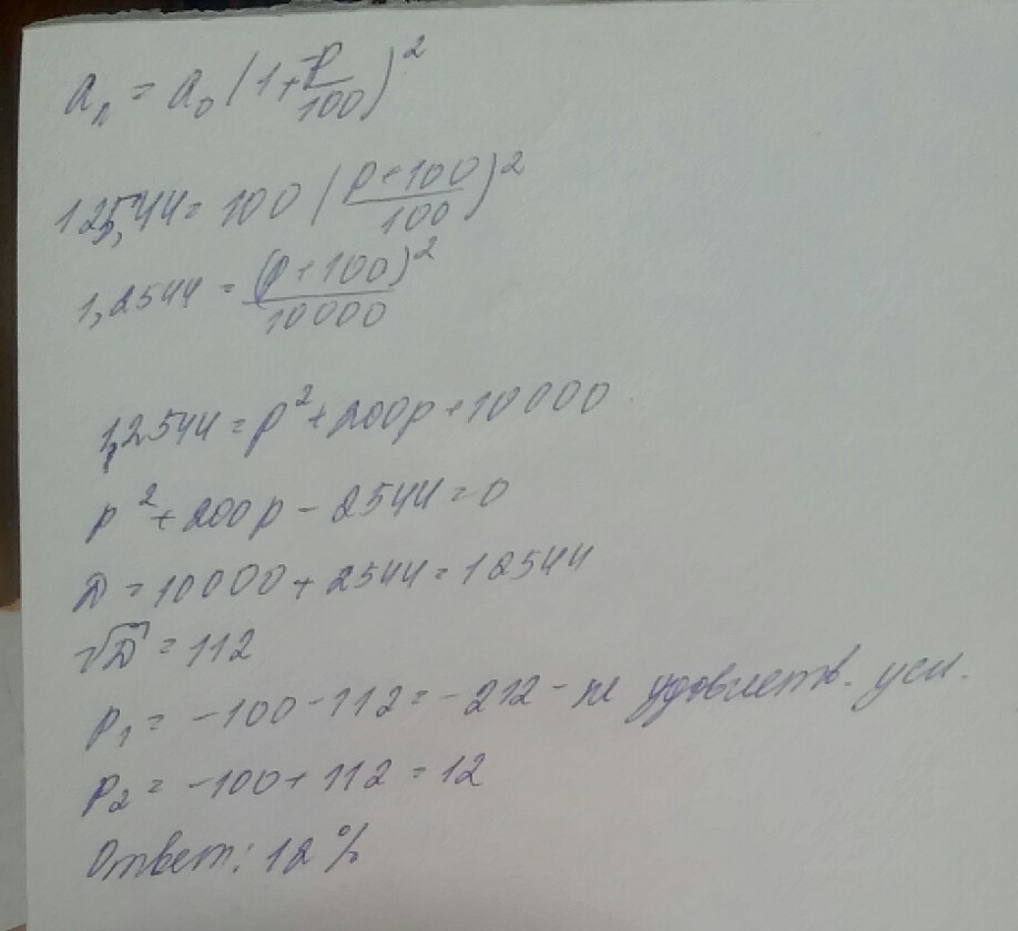 Цена товара была повышена 2 раза за один год на один и тот же процент . При таком повышении вместо 100 руб он стал стоить 125,44 руб . Определите , на сколько процентов каждый раз повышалась цена товара ?