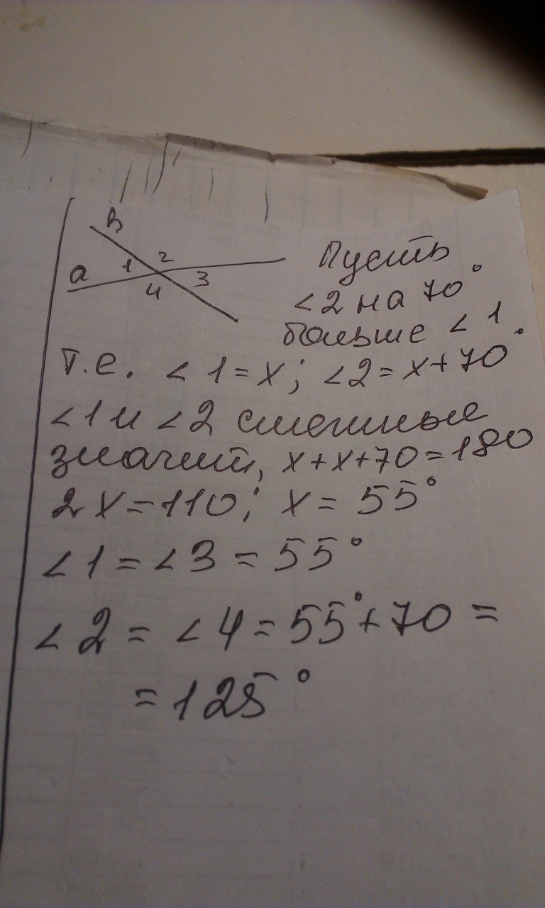 Помогите. Один из углов образовавшихся при пересечении двух прямых на 70градусов больше другого. Найти эти углы
