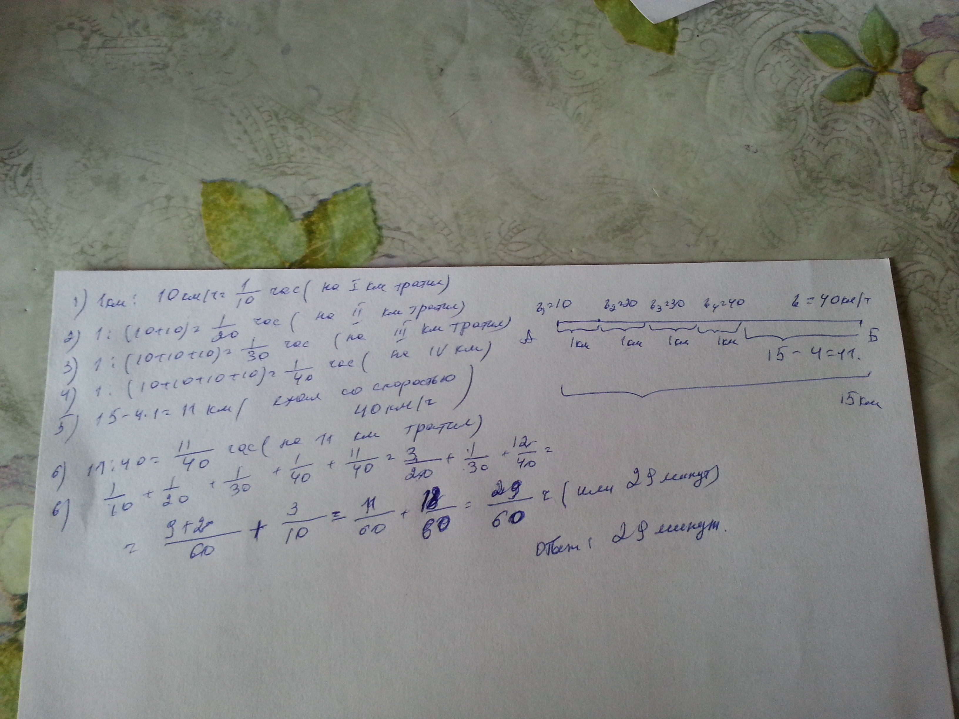 1) t1 = 1/10 + 1/20 + 1/30 = 11/60 ч = 11 мин потратил на 3 км пути.